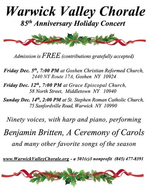 - Varying Dates & Locations – for the Warwick Valley Chorale’s 85th Anniversary Holiday Concert