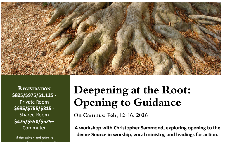 - Thursday, February 12th – Monday, February 16th – Deepening at the Root: Opening to Guidance at Pendle Hill